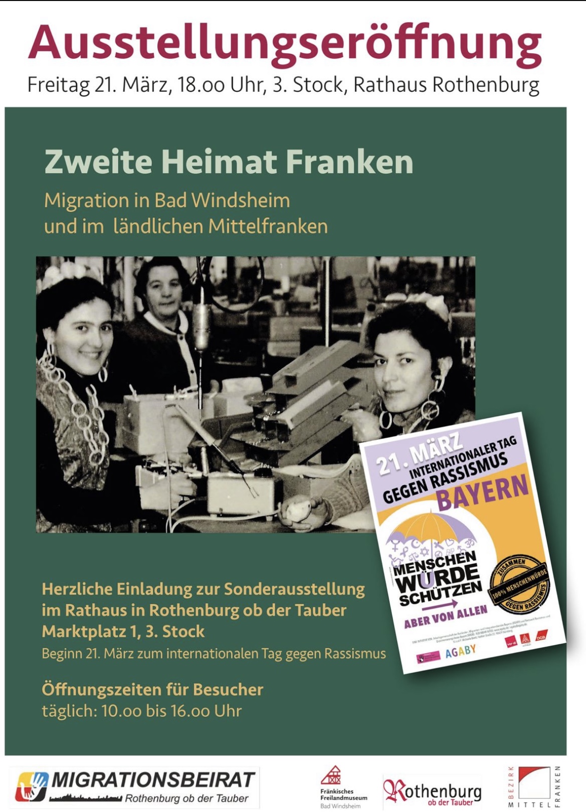 Im Rahmen der Internationalen Wochen gegen Rassismus hat der Migrationsbeirat die Ausstellung des Freiland Museums in unsere Stadt geholt. Die Ausstellung beschäftigt sich mit den Lebensgeschichten der Migranten bzw. Gastarbeiter, die in den 1960er und 1990er Jahren nach Deutschland gekommen sind und die Region Franken zu ihrer zweiten Heimat machten. In diesen Lebensgeschichten wird nachgezeichnet, welchen Beitrag Migranten zur sozialen und wirtschaftlichen Entwicklung Deutschlands geleistet haben.