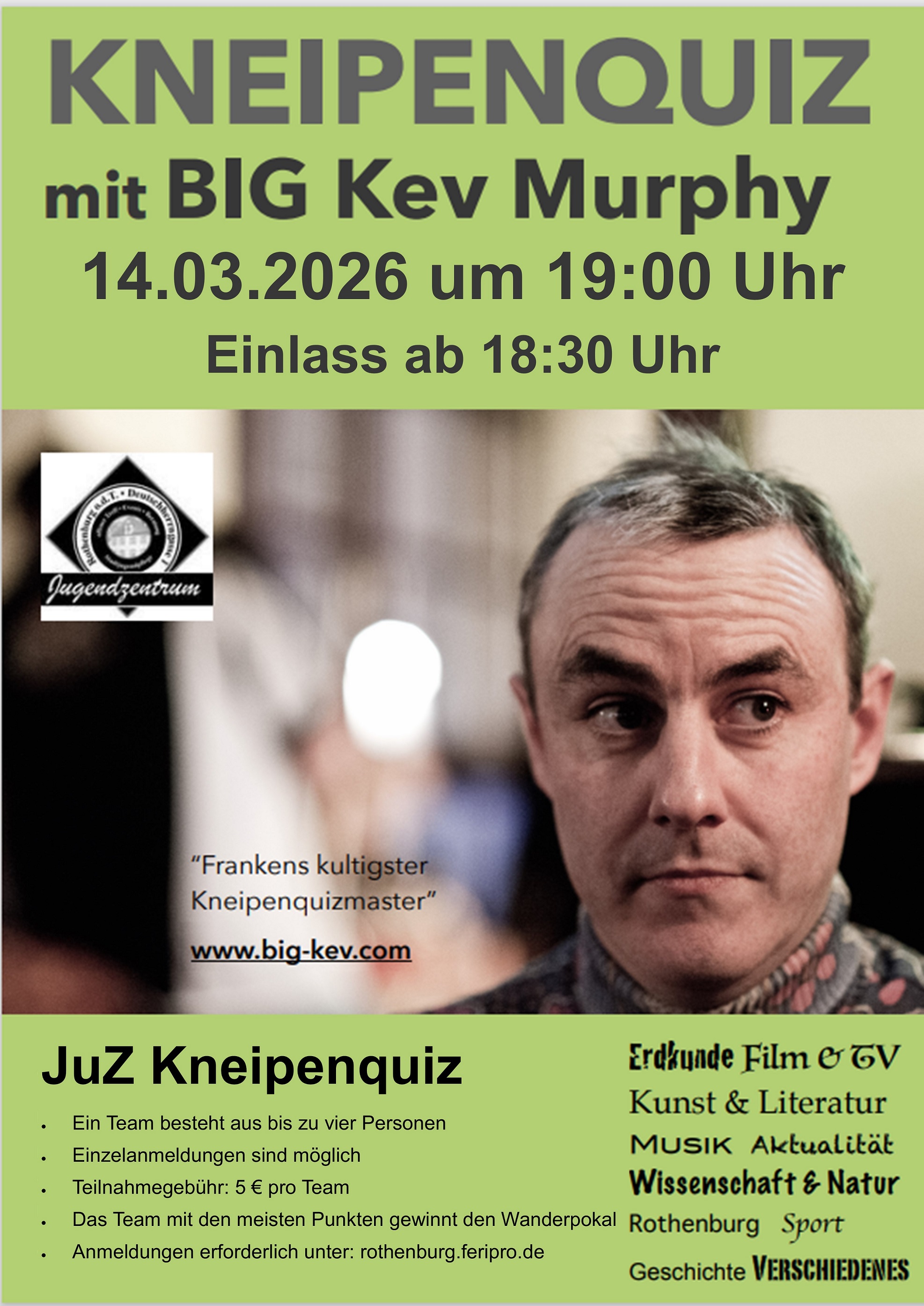 BIG KEV MURPHY ist unerbittlich, wenn es um die Beantwortung seiner Fragen geht. Egal ob Politik, Kino, Musik Literatur usw. Hier bekommt jeder seine Grenzen aufgezeigt. Kevin Dardis moderiert diesen Abend der angelehnt an „Wer wird Millionär“ Fragen aus ganz unterschiedlichen Bereichen an die Gruppen stellt. Natürlich gibt es am Schluss Gewinner und Verlierer, aber das ist eigentlich „fast“ egal. Spaß macht das allemal und beweist, dass die Gehirnzellen auch in einer (Jugendzentrums-)Kneipe in der Lage sind, zu arbeiten.