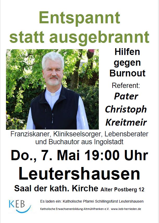 Das Phänomen "Burnout" geht wie ein Gespenst durch unsere Gesellschaft. Viele tausende Menschen erkranken jährlich an dieser totalen Erschöpfungskrankheit. Mittlerweile sind Menschen der unterschiedlichsten Berufe, Männer und Frauen, Junge und Ältere gleichsam betroffen. Was ist "Burnout"? Welche Ursachen führen dazu? Wie kann man vorbeugen und was kann man dagegen tun? Wer andauernd im "roten Bereich" lebt, lebt auf Kosten seiner ganzheitlichen Gesundheit. Nur wer auftankt, kommt auch weiter. Diesen und ähnlichen Fragen will P. Christoph (Sozialpädagoge, Theologe und psycho-spiritueller Berater) nachgehen und nach positiven Gegenstrategien Ausschau halten. Entspannung, Ausgleich, positive Beziehungen, Sport und eine gesunde Spiritualität helfen dabei, dass Belastendes leichter genommen werden kann.