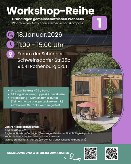Ab Januar 2026 startet in Kooperation mit Fredi Orazem, dem Forum der Schönheit und der Firma Taglieber Holzbau Oettingen eine siebenmodulige Workshop-Reihe. Hier wird die „Vision für nachhaltiges Leben” ganz konkret für die Umsetzung aufbereitet!